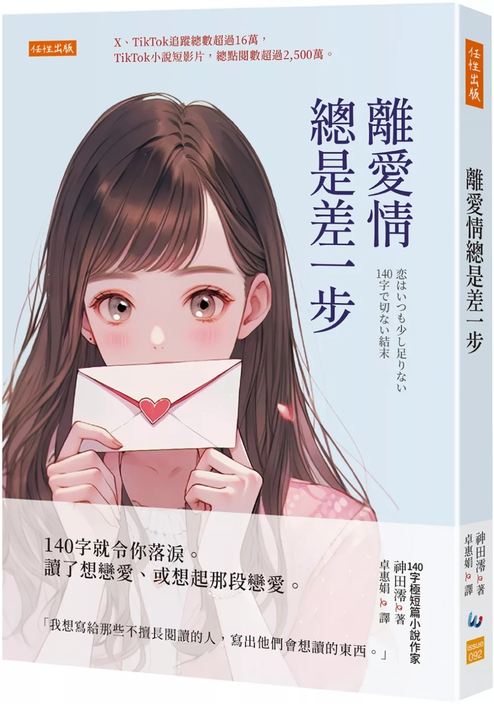 神田澪:「我想要寫出讓不擅長閱讀的人也能讀的東西。」戀愛的苦澀酸甜,青春的悸動心碎,親情的離散牽絆……141則輕盈的篇幅,是141種人生,在這之中,有沒有讓你想起了誰?如魔法般的極短篇小說,卻交織成一段段雋永的魔幻時刻。如果日子有時百無聊賴,如果夜晚偶爾無法成眠,如果生活總感到局限,那是因為我們需要故事。彷彿文字版《偶然與想像》,不到140個字的世界,卻帶給我們猝不及防的心動,掀起了漣漪無垠,看見了想像無限。