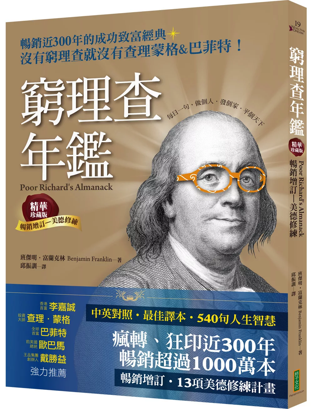 (1706-1790),有史以來最傑出的美國人之一。著名的政治家、科學家,亦是出版商、印刷商、記者、作家、慈善家;更是傑出的外交家及發明家。他是美國革命的重要領導人之一,還曾進行多項關於電的實驗,發明了避雷針、雙焦點眼鏡、蛙鞋等等。他的《窮人理查年鑑》包含了大量關於勤儉致富與為人處世的精采箴言,被譽為美國文化的基石,對美國人的價值觀產生了深遠的影響。他的《自傳》更是以其所包含的人生奮鬥成功感悟,以及對善與美德的褒揚,而被公認為是改變了無數人命運的美國精神讀本。