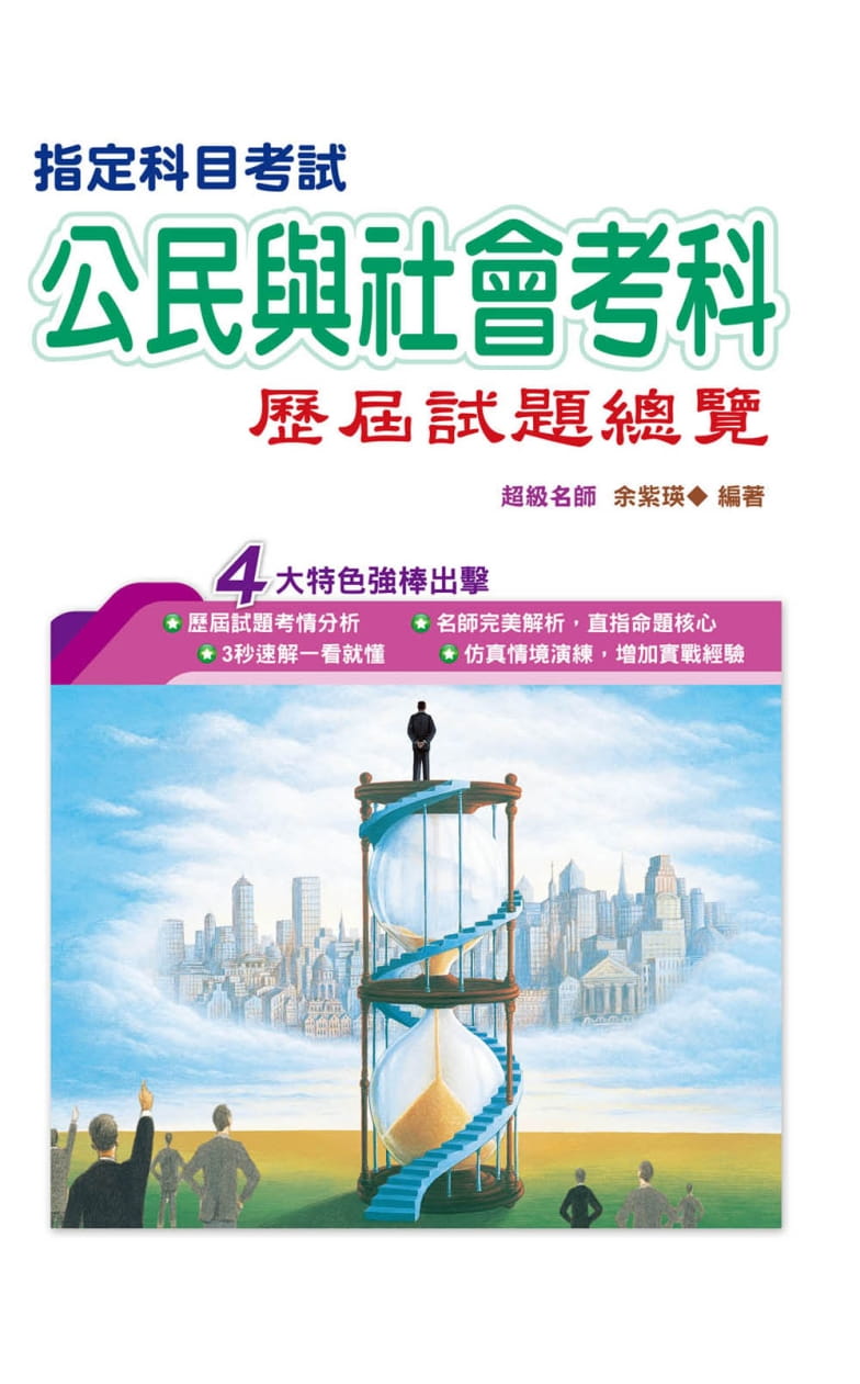 本系列套書規劃之「重點指標」標明各考題出處,將菁華提煉出來,幫助您突破學習盲點,輕鬆複習解題要點;而「3秒速解」教你快速破題,提高答題效率,讓學習不再只是單一思路。此外,本系列採用答案欄及填答畫格的設計,每個年度清楚標示考試時間及分數落點,讓您掌握作答時間、檢測自我實力,在在希望能營造擬真的作答情境,提升考生們應試的即戰力!全書一開始提供各考科的考試方向與準備要領,以及複習時間與自我勉勵狀況的紀錄,利於同學們安排進度、抓住重點複習,奠定勝利的基石!