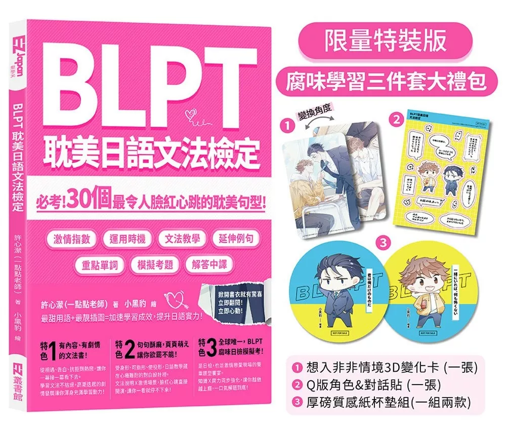 只要你願意進入BLPT 耽美日語檢定的世界,你就會發現,學習日語,原來也可以這麼酥麻、這麼歡快、這麼美好......因為,這是全世界最甜、最腐,也最有效的日語檢定書——獻給因愛發電、為腐而學的你。?