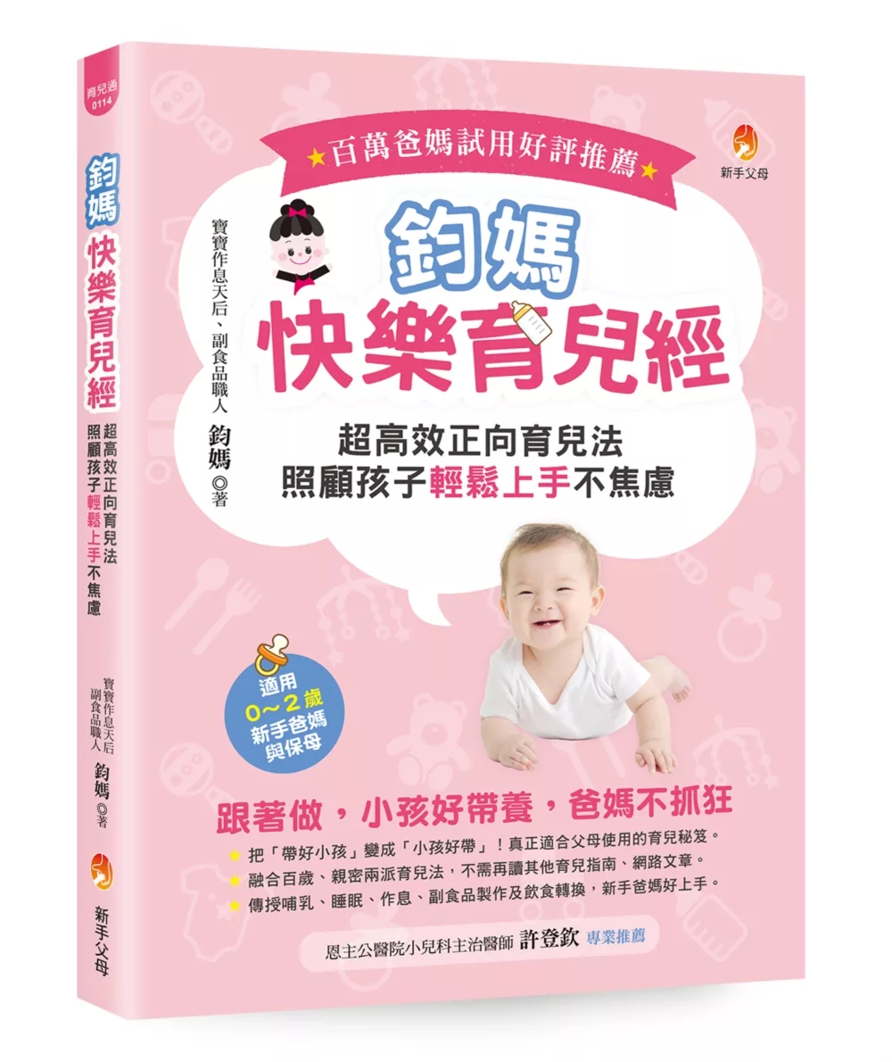 有句廣告詞:「我是從成為媽媽(或爸爸)第一天才開始學習當媽媽(或爸爸)。」身邊的親朋好友也常在產後說:「真想把寶寶塞回肚子裡。」最離譜的是聽到被寶寶「歡」到受不了的婦產科醫師發出驚人之語:「被他(新生兒)吵到嚴重睡眠不足,又要值班,真想把他丟到垃圾桶。」蝦米!你可能無法想像辛苦懷胎十個月的小天使為何有時候會變成小魔鬼。鈞媽的這本書,是從快樂育兒的角度,深入淺出分享她個人的寶貴經驗,讓大家能夠不要迷信大道理也能帶好小孩!──張桂玲(台大醫院護理長、國際認證泌乳顧問)