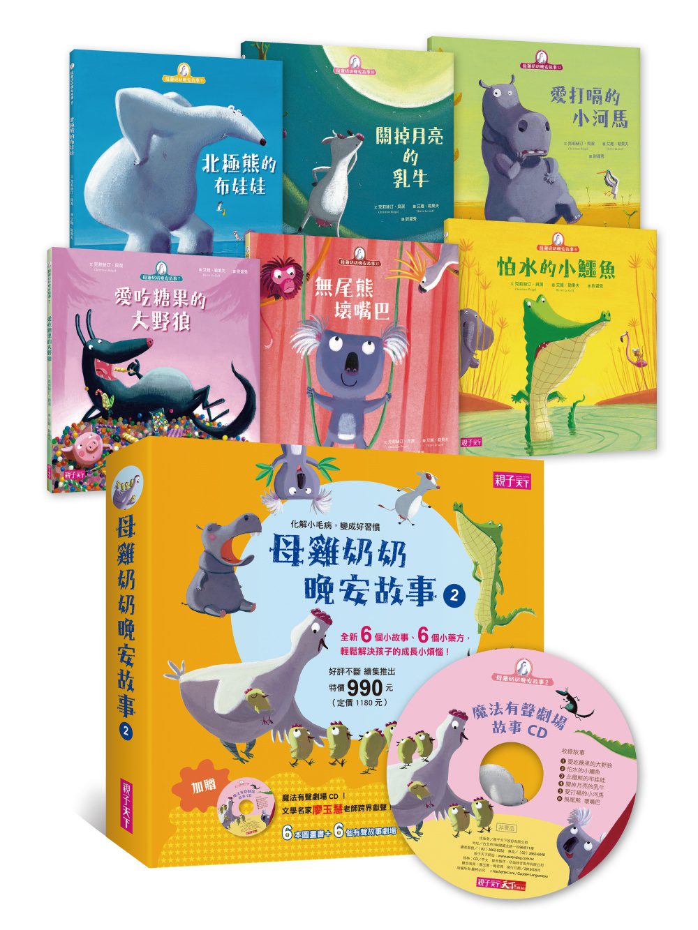 【母雞奶奶晚安故事】套書2:愛吃糖果的大野狼、怕水的小鱷魚、北極熊的布娃娃、關掉月亮的乳牛、愛打嗝的小河馬、無尾熊壞嘴巴(6書+1CD)