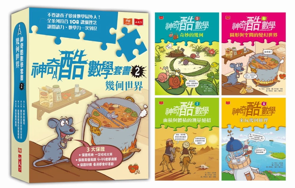 閱讀這一系列的書籍,孩子們可以經由數學家的故事學習畢達哥拉斯、歐幾里德的思維,認識各種數學符號與常用的記數系統,知道0的發明過程;也可以學習一天的由來與日期時間的計算;無縫隙拼排與阿基米德,分別結合了藝術與科學領域,拓展孩子們的視野。書本中猜謎與推理的情節,以及有趣的小魔術,滿足了孩子扮演小偵探和魔術師的想望,想不愛數學都難。