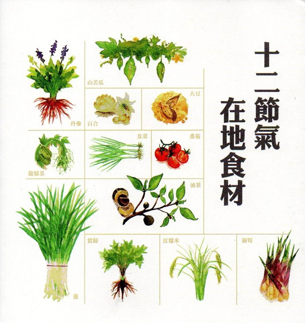 本書收錄驚蟄-韭菜、立春-青蔥、春分-箭筍、立夏-龍鬚菜、夏至-山苦瓜、小暑-大豆、小滿-番茄、立秋-百合、霜降-紅糯米、立冬-苦茶油、冬至-丹參、大寒-當歸等十二項節氣食材,其中有些是餐桌上常見的菜色,有些具有保健養生的功能,還有原住民部落的特色食材。