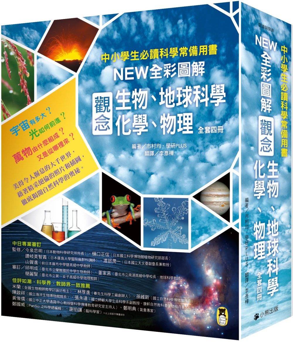 此書為「中小學生必讀科學常備用書」系列(全套四冊) , 另有《NEW全彩圖解觀念生物》、《NEW全彩圖解觀念化學》、《NEW全彩圖解觀念物理》,完整照顧國中三年的自然科學課程。